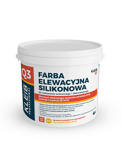 KLEIB Q3 jest elewacyjną farbą silikonową, przeznaczoną głównie do malowania cienkowarstwowych tynków mineralnych i silikonowych w systemach ociepleń budynków KLEIB i KLEIB W. Nadaje się również do stosowania na mineralnych podłożach takich jak: niemalowane tynki cementowe, cementowo – wapienne, nieotynkowane mury z betonu, cegieł, bloczków, pustaków ceramicznych lub silikonowych. Farba może być stosowana na zewnątrz budynku do malowania ochronnego i dekoracyjnego